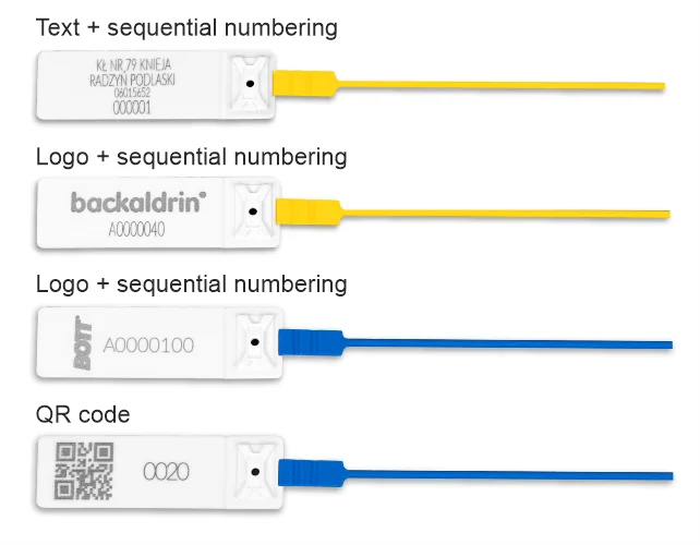 Sigillo a cordoncino Sibo-L con camera di tenuta in metallo a lunghezza regolabile. Il sigillo a cordoncino Sibo-L con bandiera bianca e cordoncino colorato è progettato per piccole produzioni. Il sigillo di sicurezza Sibo-L viene utilizzato per sigillare trasporti, container, porte e armadi. Il sigillo di sicurezza Sibo-L è disponibile in quattro versioni a colori e il cordoncino può essere rosso, verde, blu o giallo. I sigilli a cordoncino sono stampati con una tecnica laser ad alta resistenza. Le opzioni di stampa disponibili includono diciture, logo, numerazione o un codice QR variabile.