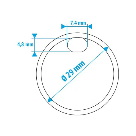 Ficha de plástico con orificio para colgar, diámetro 29 mm, disponible en 8 colores, reutilizable.