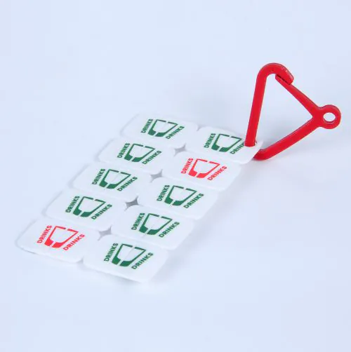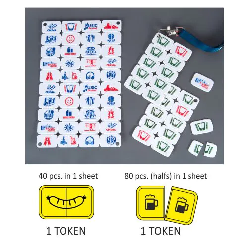 Fichas de festival de un solo uso, disponibles en hojas, cada hoja tiene un práctico orificio que permite colgar la ficha, por ejemplo, en un cordón. Disponible en diferentes colores.